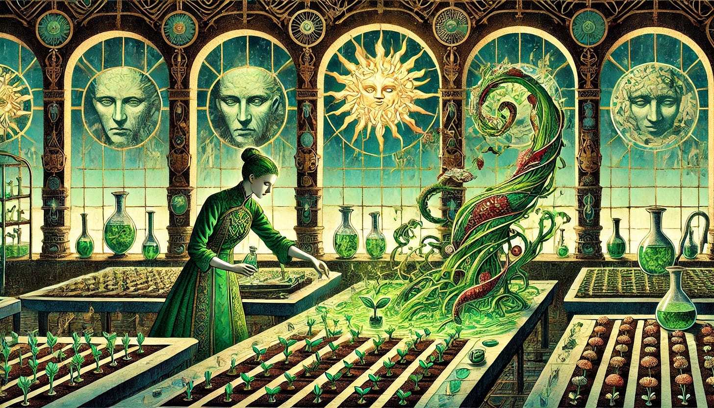 SPRING: Denial sprouts in ordered rows, as a figure in chlorophyll-green tends to young shoots. Her eyes are drawn to a wild tendril curling through the shadows. Behind her, frozen faces stare in engineered serenity. At her feet, a spilt phial seeps into forbidden soil.