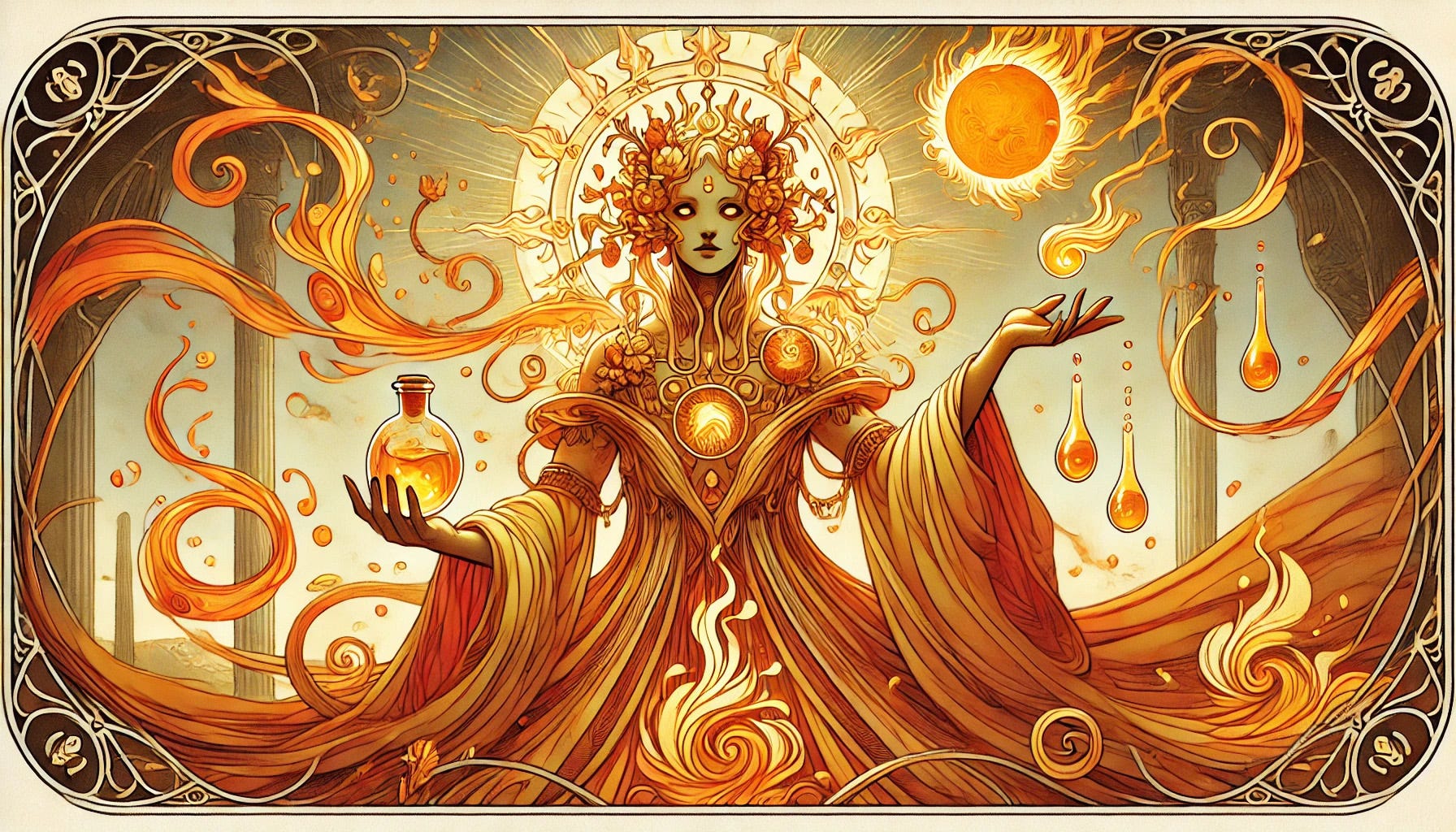 SUMMER: Flasks and beakers froth and bubble with anger and other stifling fevers, while a figure in flame-gold protective gear scribbles furtively. As the chamber shimmers with simulated midday heat, the glass cracks and hues begin to bleed.