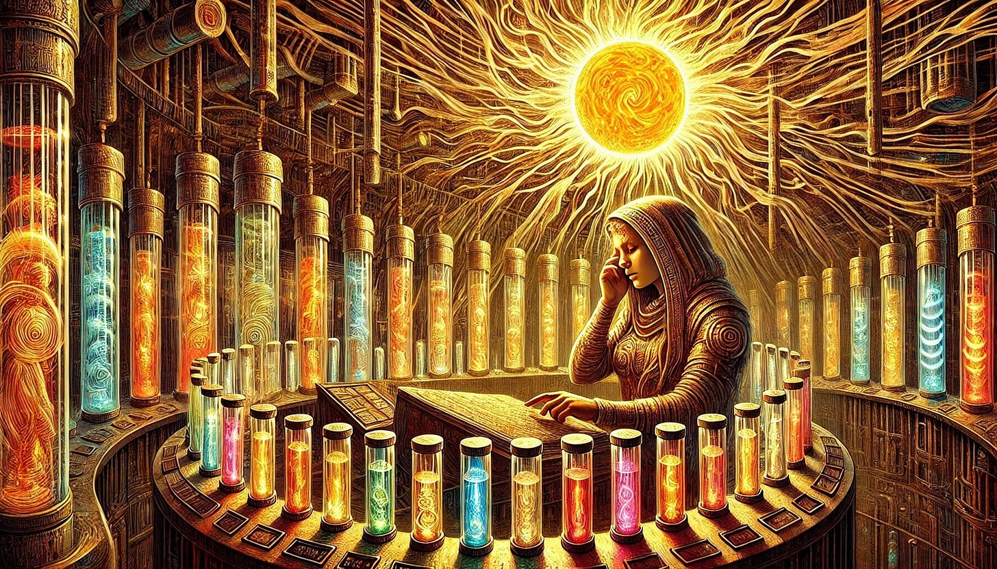 The light flickers on the monitor. I hastily stuff the journal back into its drawer, shifting my attention to the task at hand. A contaminated sample. Instead of emitting its usual fierce blood-red glow, this flask of pure rage is flecked with gold. I glance furtively around before giving it a shake: the flecks briefly dance and sparkle before a tendril of indigo swirls around lethargically and sinks back to the bottom.